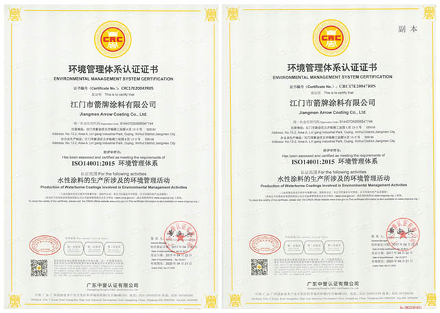 箭牌涂料ISO14001:2015环境管理体系认证证书